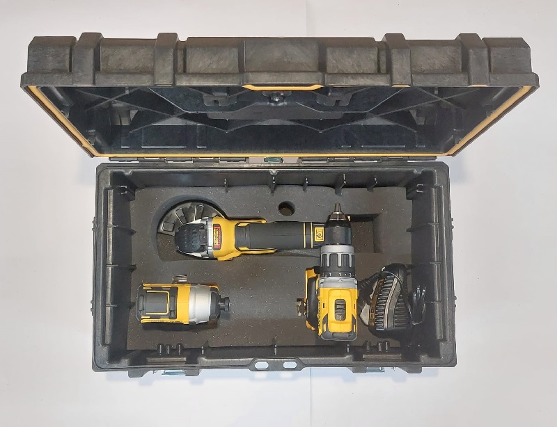 This foam inlay fits in the DeWalt 1-70-322 DS300 Toughsystem Tool Box It can house an Combi Drill (DCD796), Grinder (DCG405) and Impact Drill (DCF887).