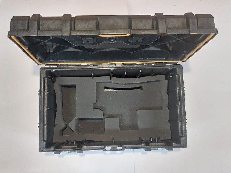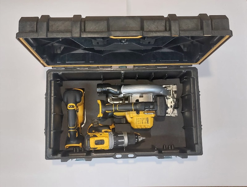 This foam inlay fits in the DeWalt 1-70-322 DS300 Toughsystem Tool Box It can house an Combi Drill (DCD796), Jigsaw (DCS334/DCS391) and a Circular Saw (DCS565).